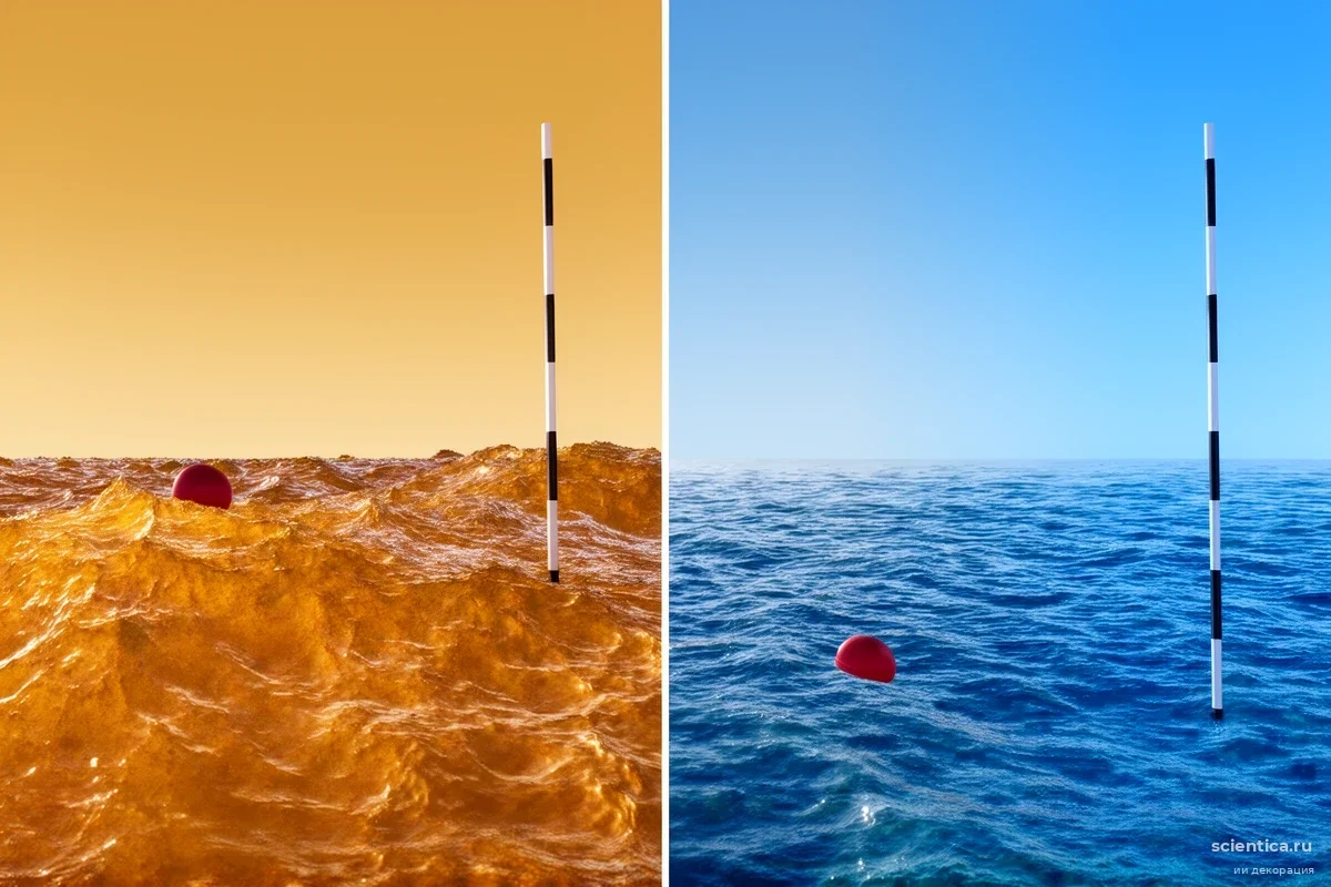 На Титане вместо воды — жидкий метан и этан. Сочетание легкой жидкости, низкой гравитации и разреженной атмосферы создает фантастический эффект: слабый ветер гонит огромные стены воды, которые движутся словно в замедленной съемке. На Земле такое физически невозможно. Наблюдатель на берегу Титана может ощущать лишь легкое дуновение, видя при этом, как на него надвигается трехметровая водяная гора.